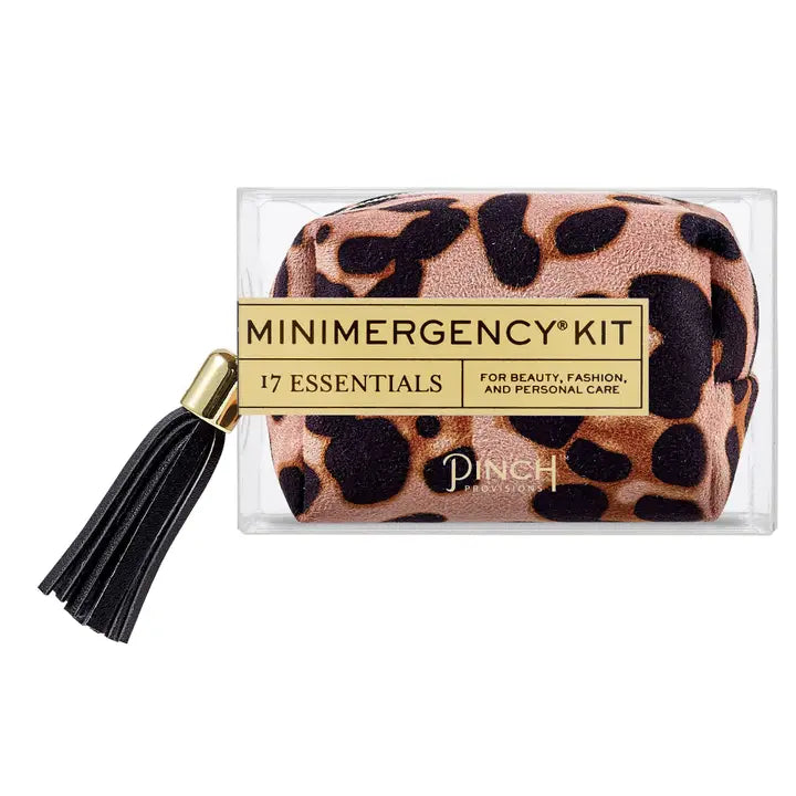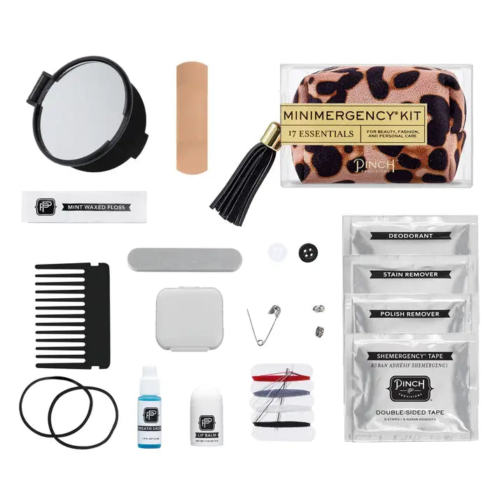 Navigate the urban jungle in style with a Leopard Minimergency® Kit by Pinch Provisions®. With 17 beauty, personal care, and style essentials, our signature petite pouch contains everything a gal needs...IN A PINCH®! The kit contains: stain remover towelette, emery board, double-sided tape, pill container, safety pin, lip balm, mending kit, mini comb, hair bands, dental floss, earring backs, adhesive bandage, nail polish remover pad, deodorant towelette, extra buttons, compact mirror and breath freshener. Perfect to keep in your summer tote!