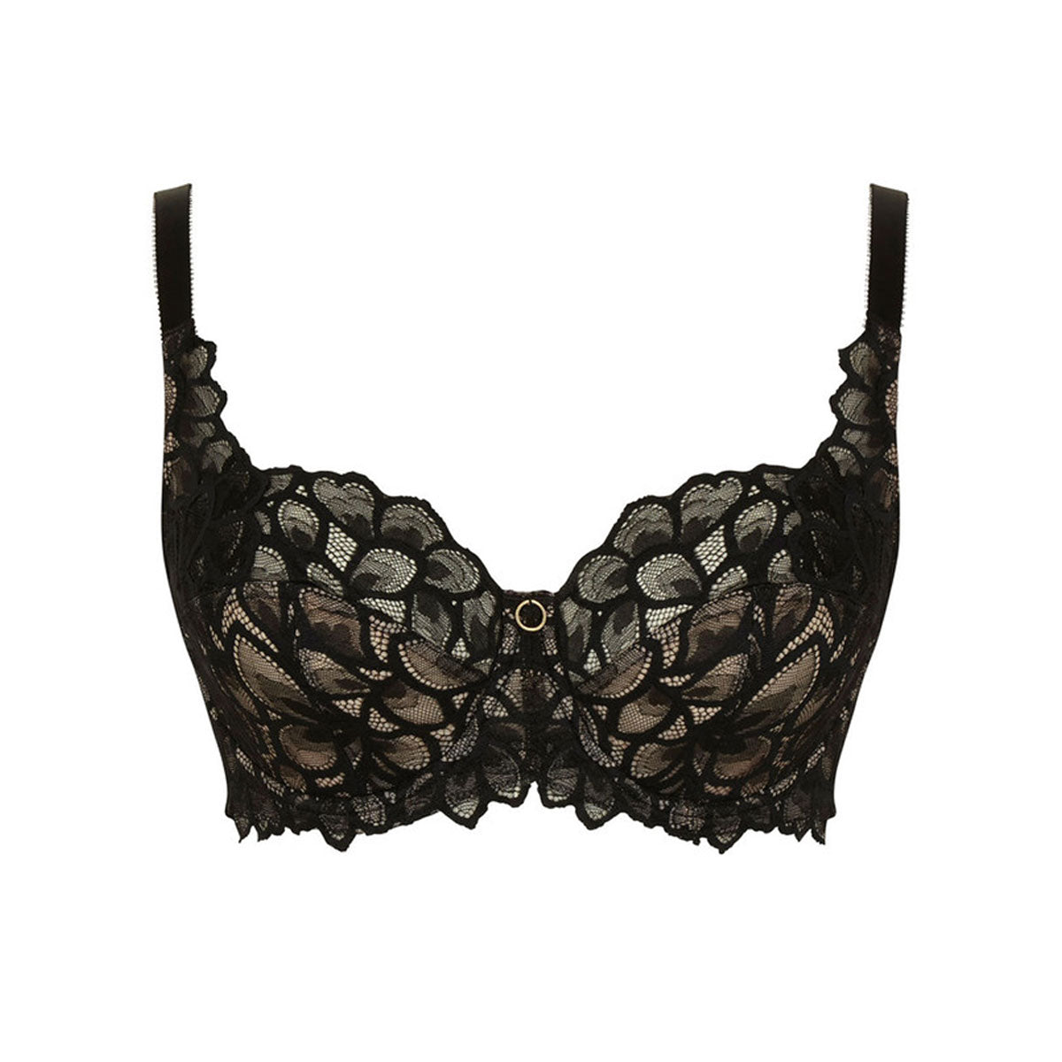 Indulge in luxury with our Panache Allure Full Cup bra in Black/Latte. The bestselling Clara Full Cup shape provides uplifting support, while the stretch floral lace and elegant gold ring details make this a must-have for fuller busts. Experience ultimate comfort and confidence with every wear.