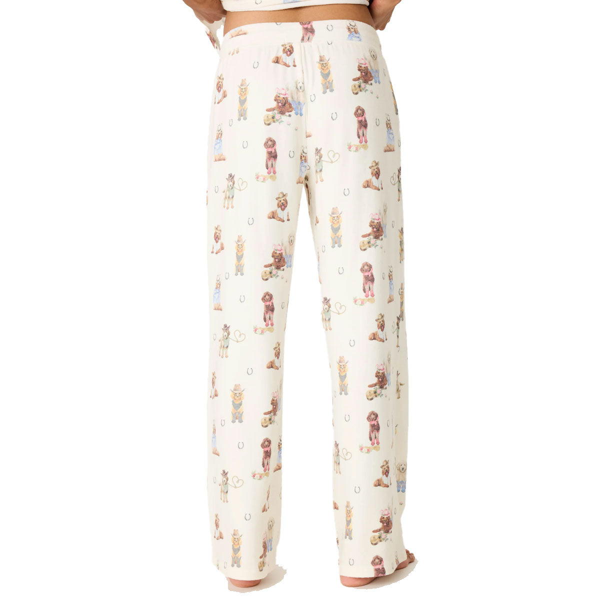 Round up some cozy charm. These ivory lounge pants—crafted from soft peachy jersey—feature a relaxed fit, drawstring waist, and an allover western dog print with cowboy hats, boots, guitars, horseshoes, and playful pups ready for the rodeo. Perfect for pairing with the matching top for a look that’s paws-itively adorable.