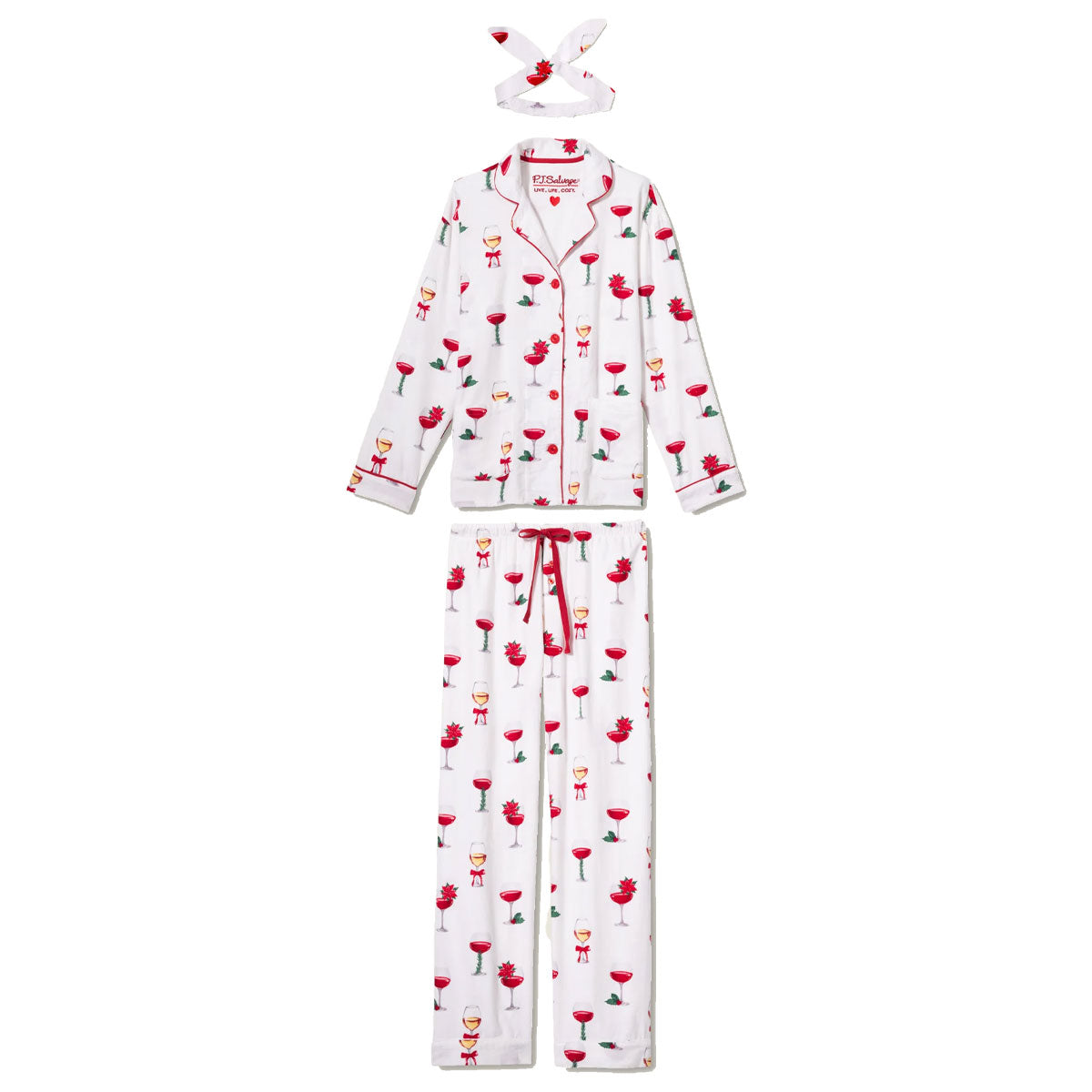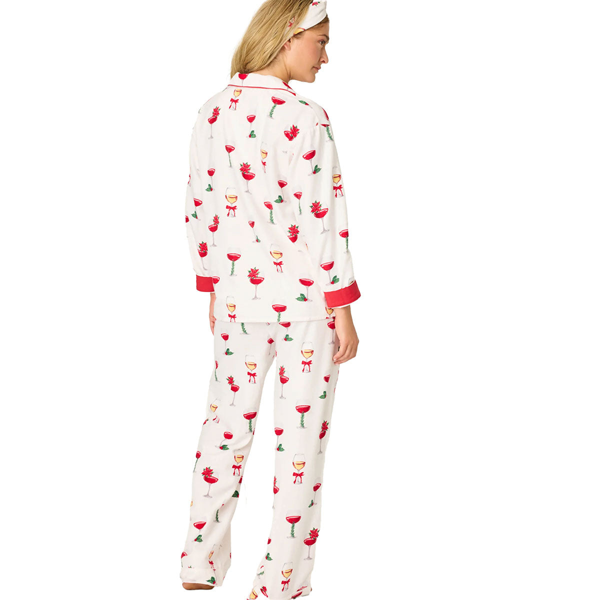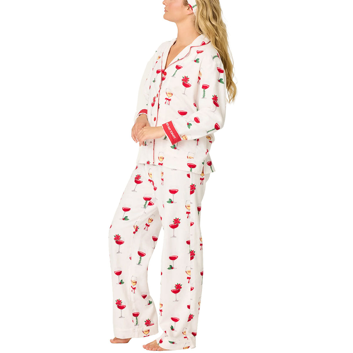 Raise a glass to cozy season in this ivory cotton flannel pajama set, patterned with festive wine glasses topped with poinsettias, bows, and sprigs of holly. This plus-size three-piece design includes a button-down top finished with red piping, relaxed drawstring pants, and a matching headband—perfect for holiday happy hours, wrapping marathons, and fireside lounging.