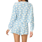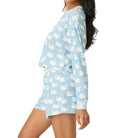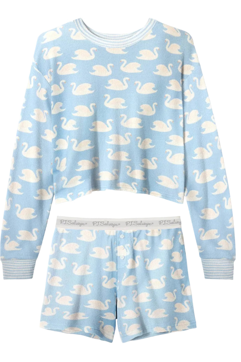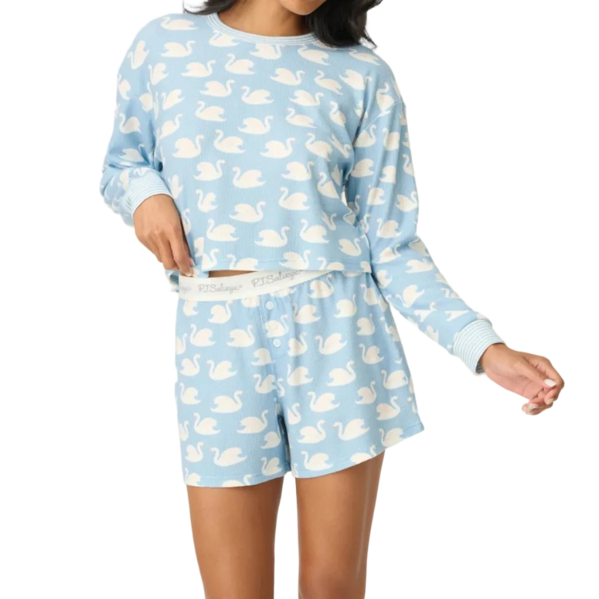 - Women’s blue 2-piece boxer short set with swan print in baby peachy waffle fabric featuring a long sleeve top and boxer shorts.