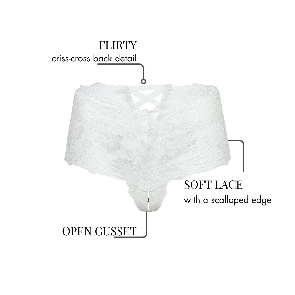 Turn up the heat with the Oh La La Cheri Good Night Kiss Lace Crotchless Boyshort, a playful mix of elegance & sensuality. These lace crotchless boyshort panties hug your curves just right, featuring a flirtatious crisscross lace-up back & buttery soft galloon lace with scalloped edges for a look that’s as romantic as it is daring. Perfect for adding a hint of spice,