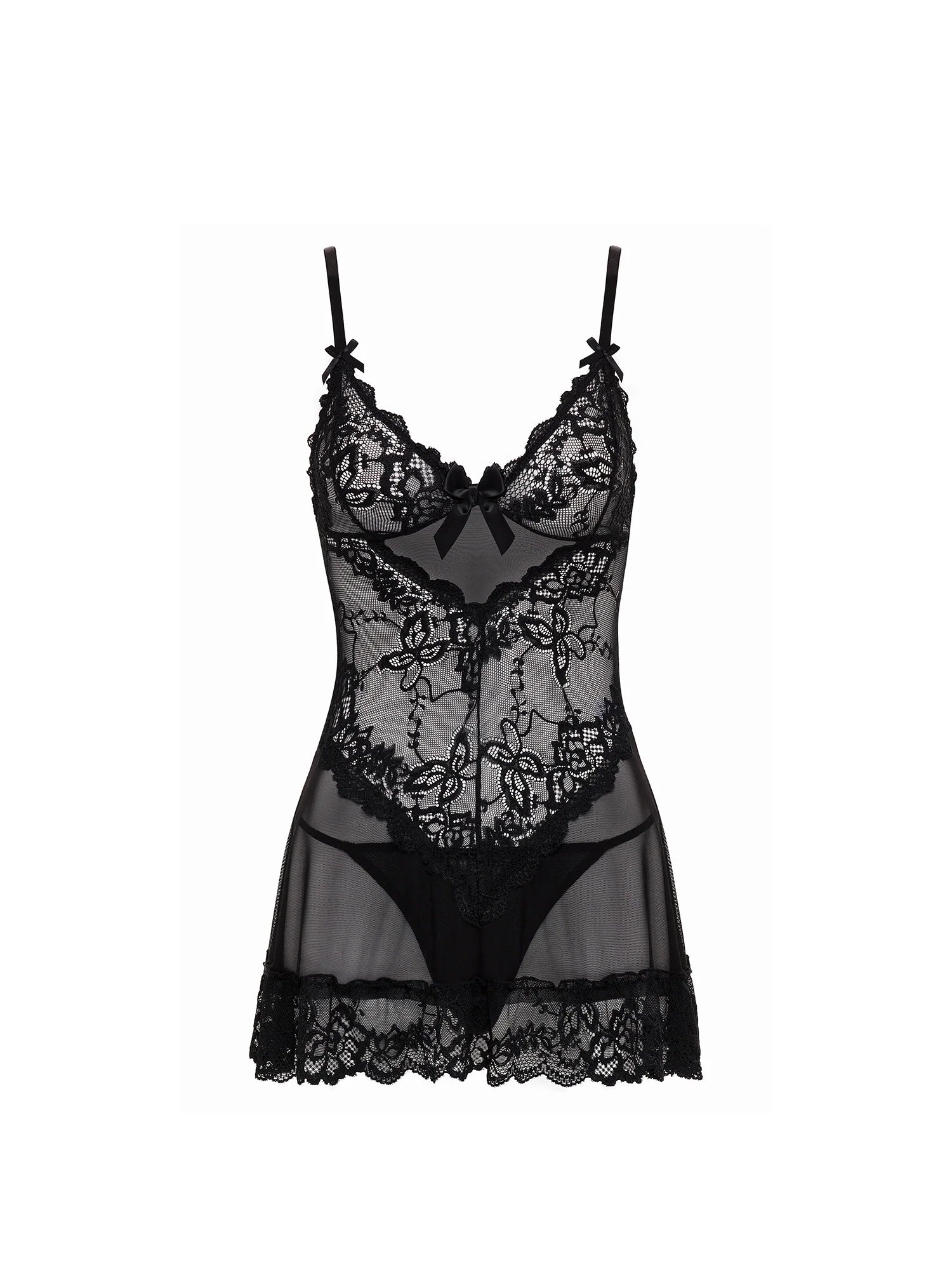 - Sheer mesh body with lace inserts and ruffled lace hem