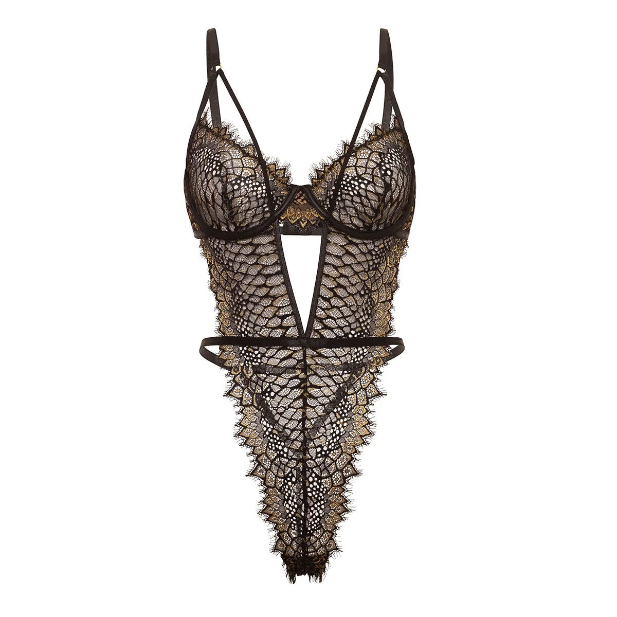 The Greta Lace Teddy from Oh La La Cheri is an ideal present for the holiday season or a seductive addition to your New Years celebration. Crafted from luxurious black and gold snake lace, this piece offers additional support with its underwire design. Its intricate cage straps, adjustable straps, and G-string back make it the perfect complement to your favorite black bottoms.