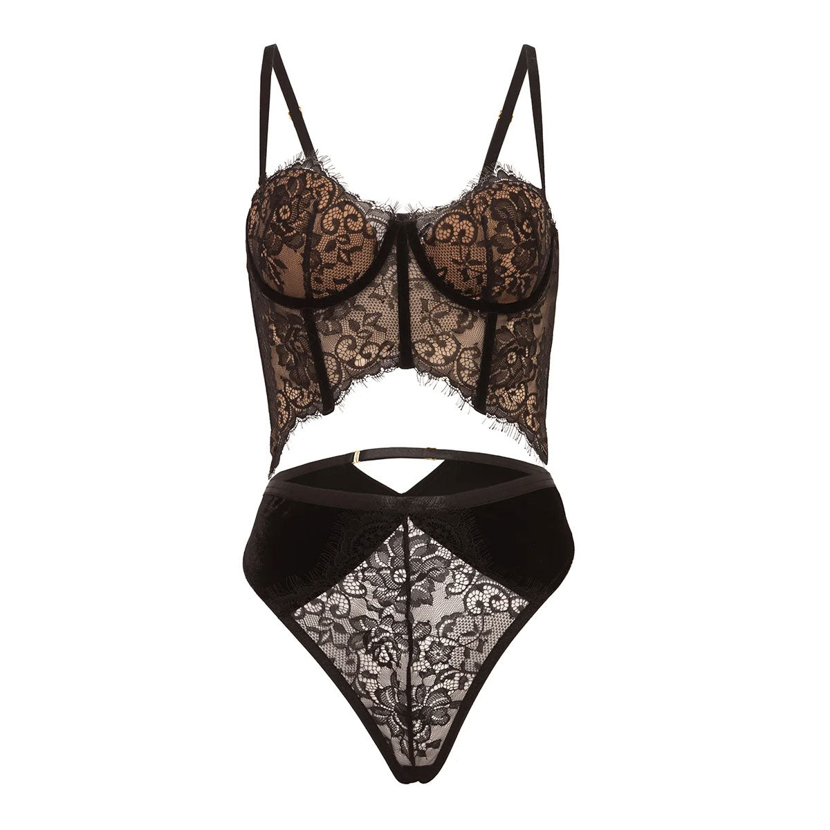 - UNDERWIRE PADDED CUP EYELASH LACE AND VELVET BUSTIER WITH MATCHING PANTY