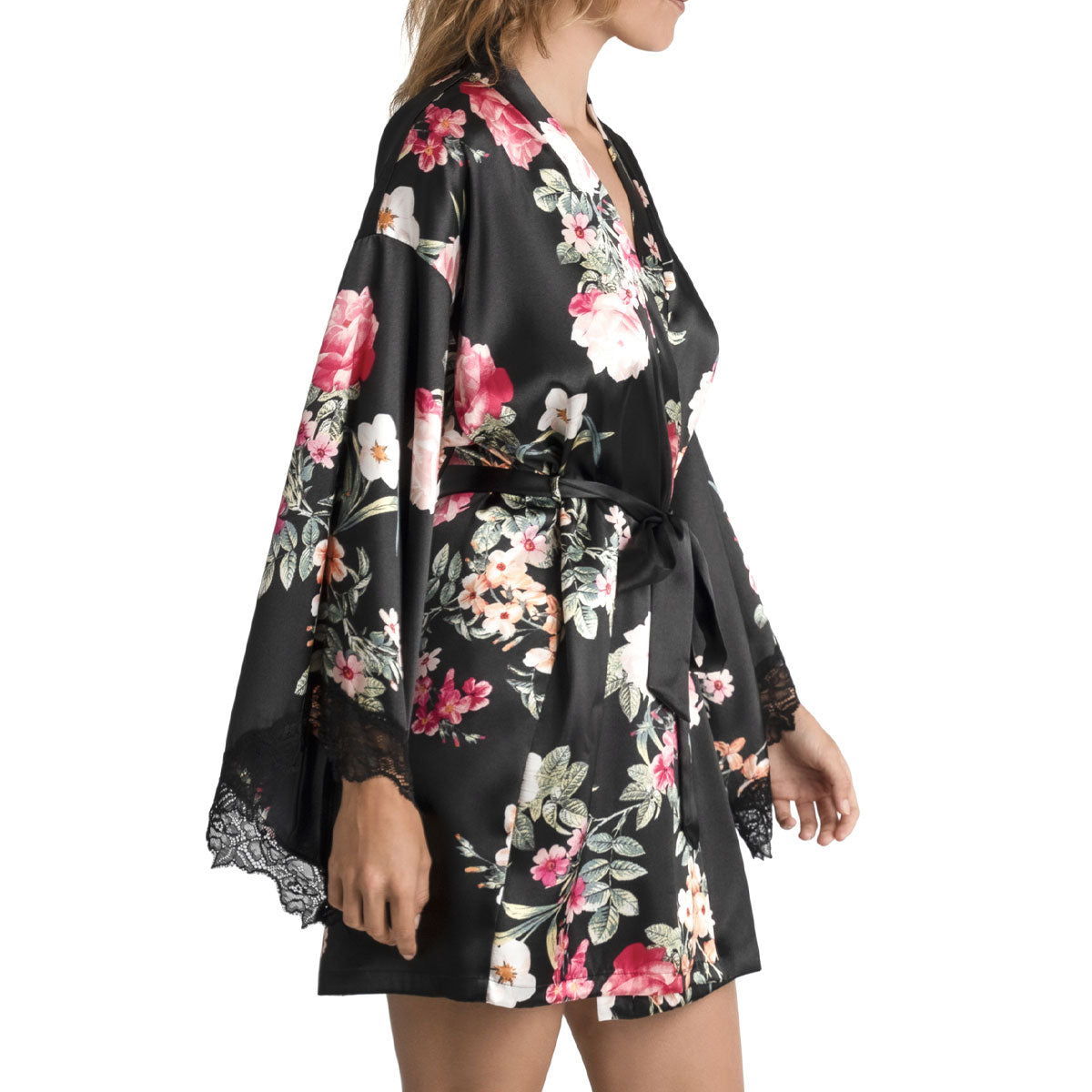 Be the coziest for the holidays in our In Bloom Holiday Romance Wrap Robe. The black floral print is adorned with kimono-style sleeves and lace trim, perfect for a romantic evening. Crafted from luxe satin polyester, it pairs perfectly with the Holiday Romance Chemise or your favorite nightwear. Enjoy a special night in this must-have wrap!