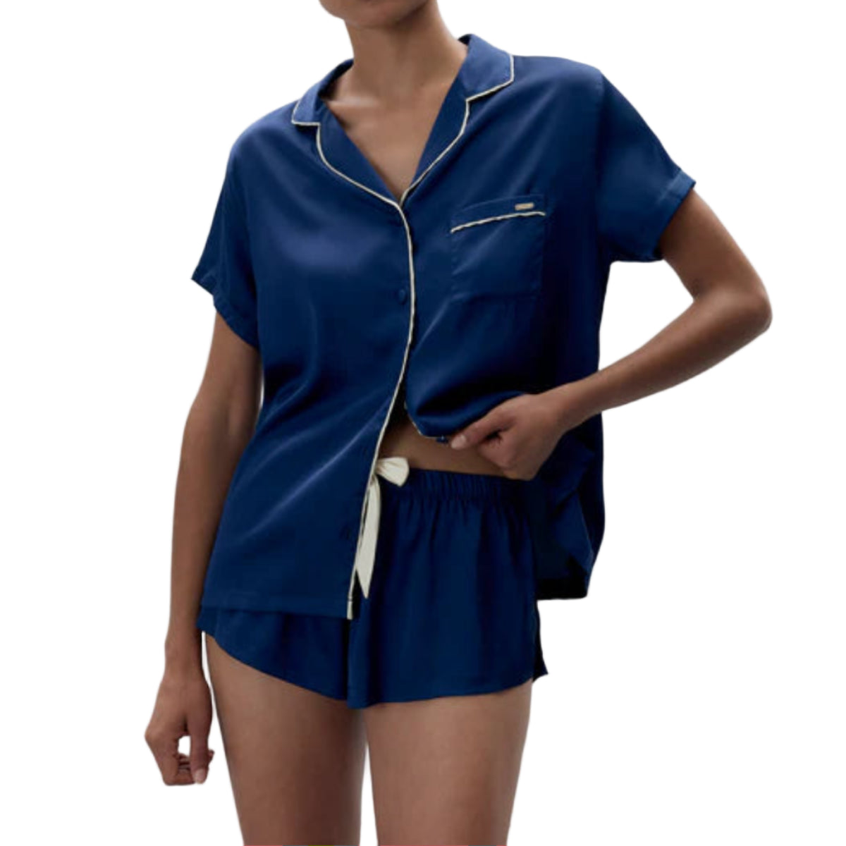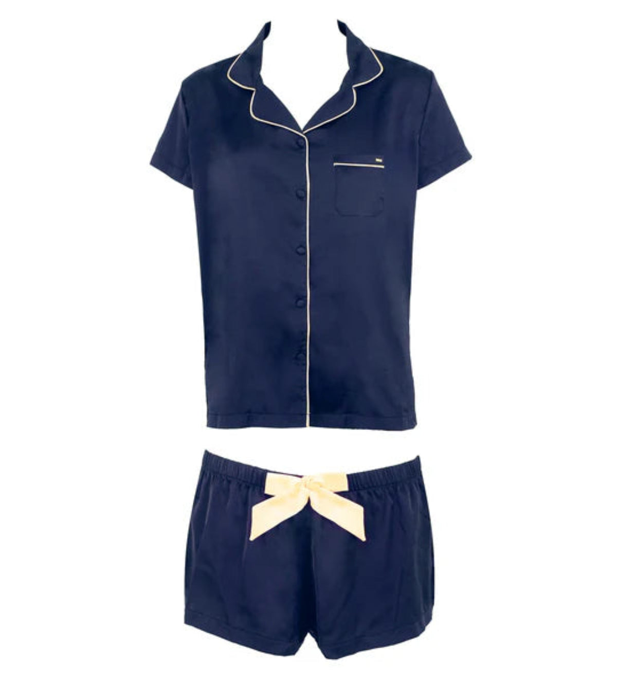 42363 Abigail Luxury Satin Short Pajama Set | Navy Blue/Cream
