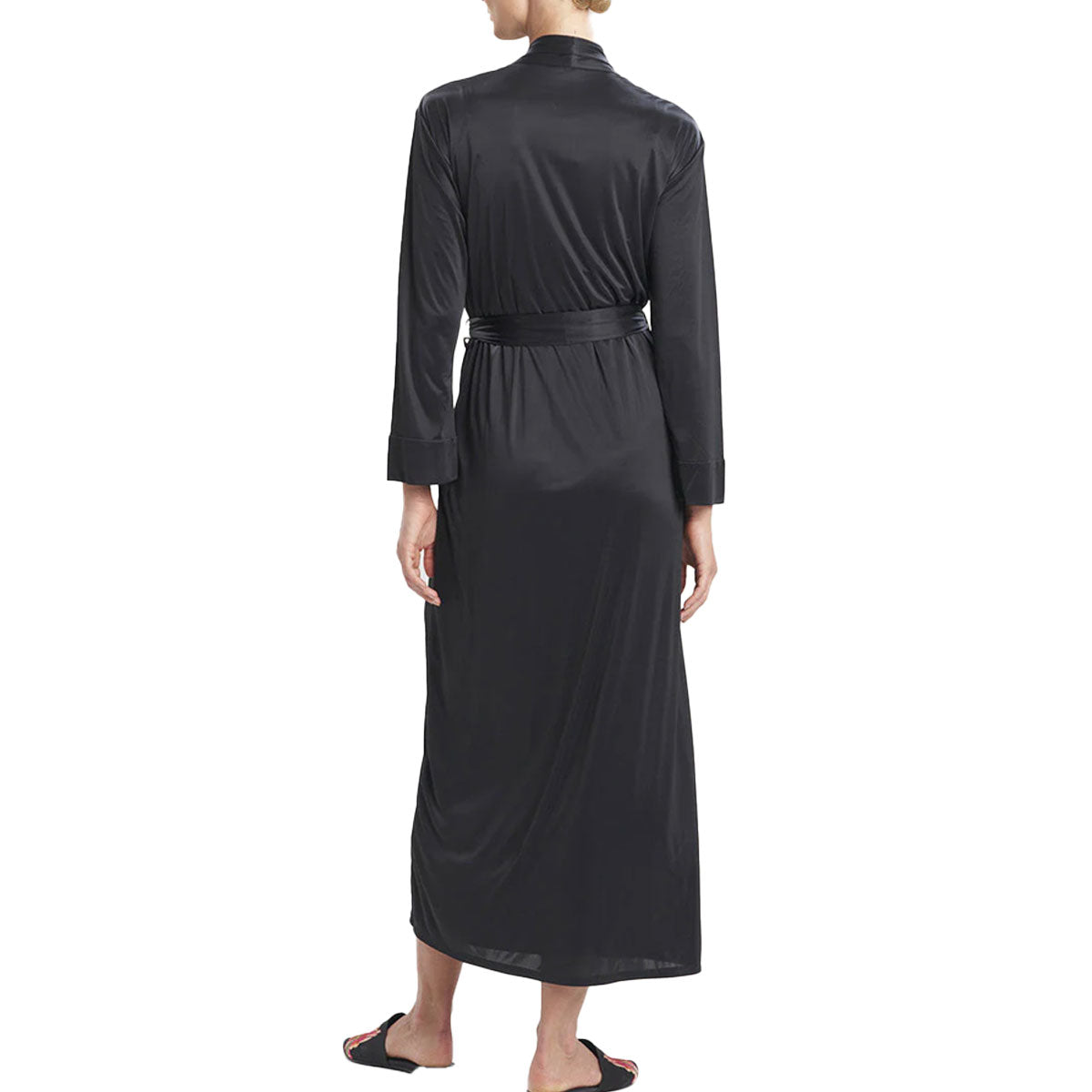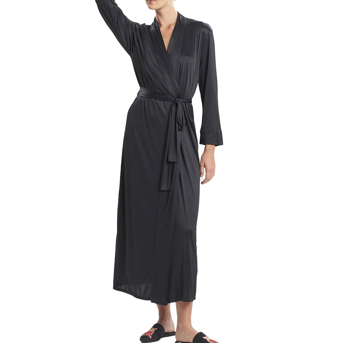Experience luxurious comfort with the N. Natori Aphrodite Wrap in Black. Crafted from smooth, cool-to-the-touch slinky knit fabric, it drapes gracefully without clinging, offering a flattering fit. The robe features a self-tie belt threaded through side seam loops, providing adjustable waist definition. Measuring 52" from the center back neck, it delivers just the right length for elegant coverage and effortless style. Perfect for lounging or layering, this robe combines comfort and sophistication seamlessly.