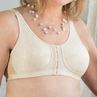 The American Breast Care Front Close Rose Contour Bra is expertly designed for an average profile, providing effortless lift and support without the discomfort of a wire. With its front hook closure and stretch straps, this bra offers easy wear and adjustability. Its seamed, soft cups and pocketed design are constructed with a feminine rose detail and jacquard fabric, for both comfort and style.