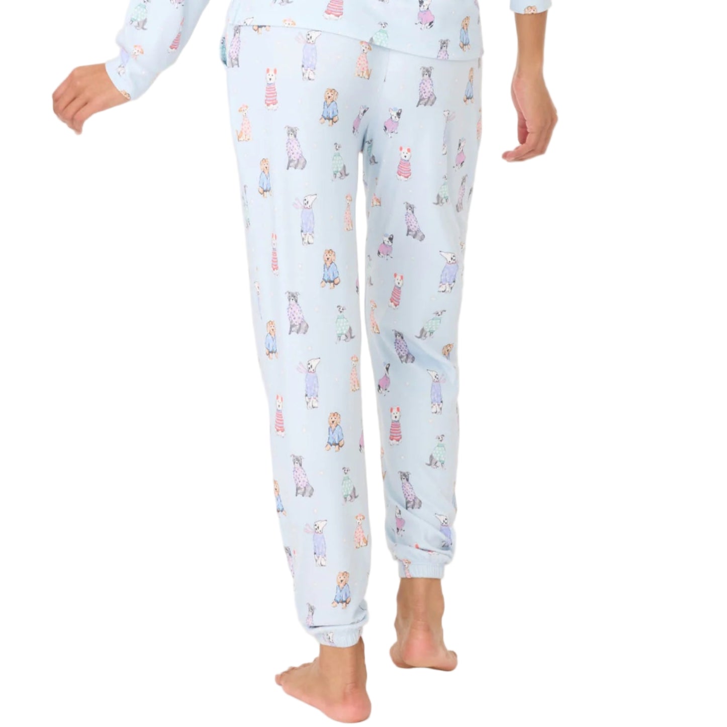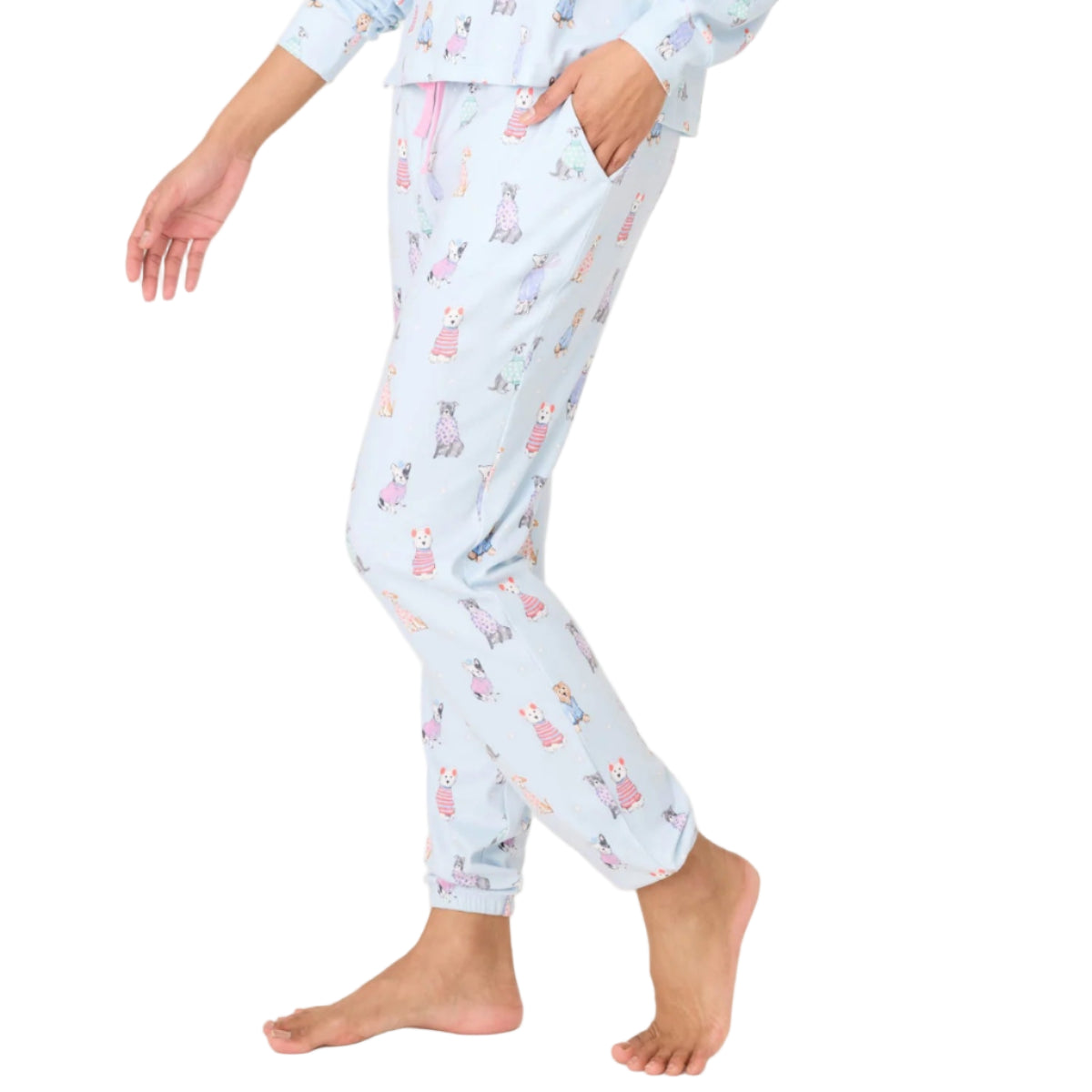 Paw-sitively cozy and snow much fun, this P.J. Salvage pajama banded cuff pants is crafted from double-brushed pointelle with a light blue backdrop dotted in playful pups dressed for winter. This pajama bottom brings extra comfort and charm—perfect for snow days, couch hangs, and curling up with your four-legged friend.