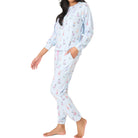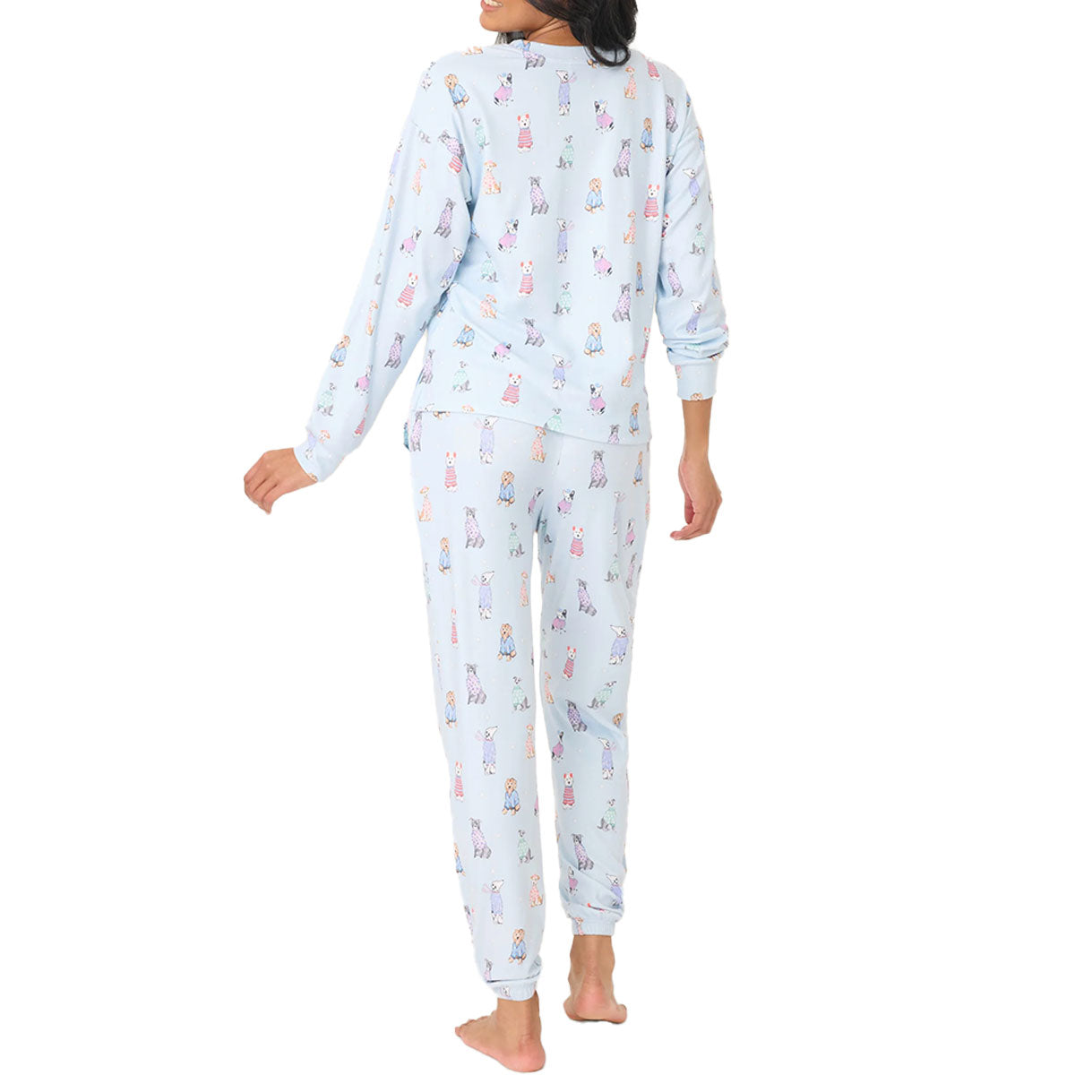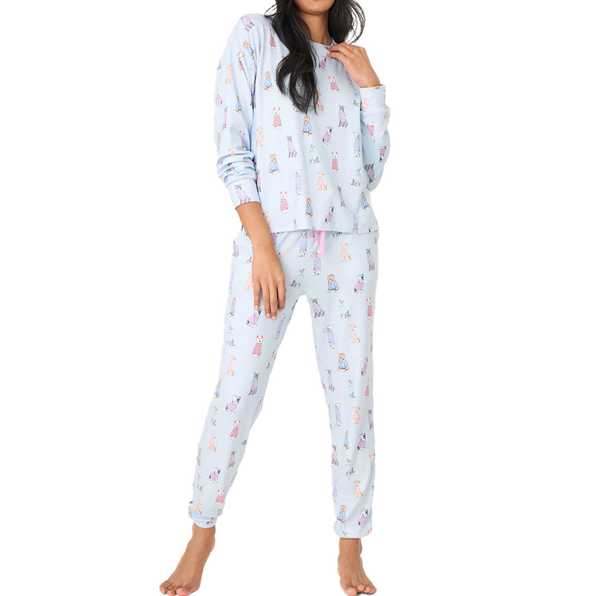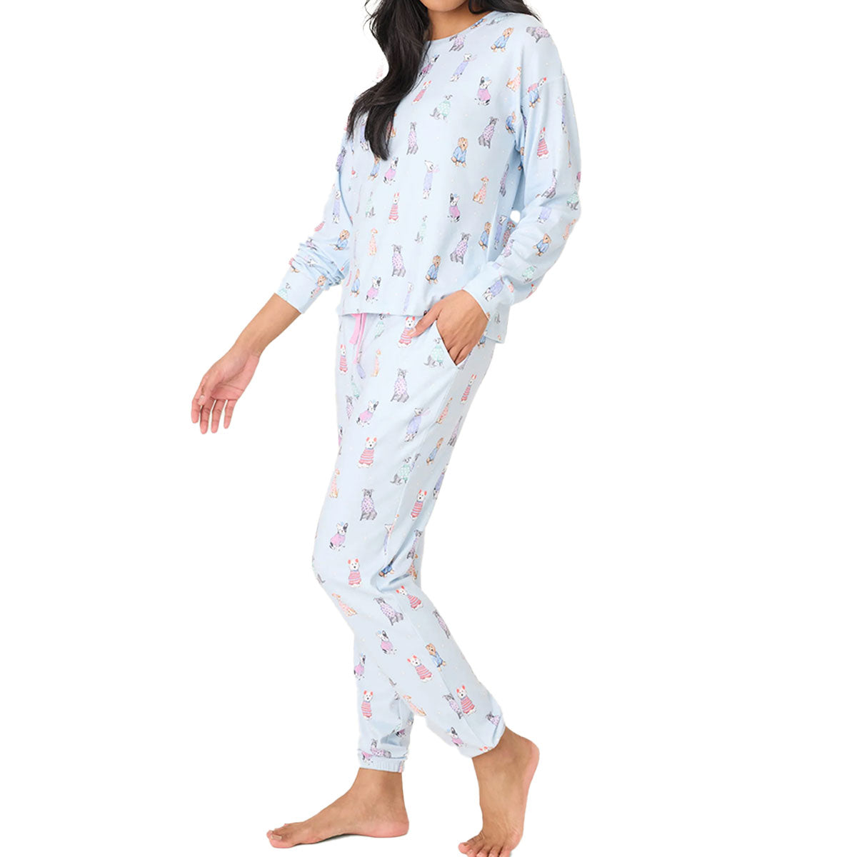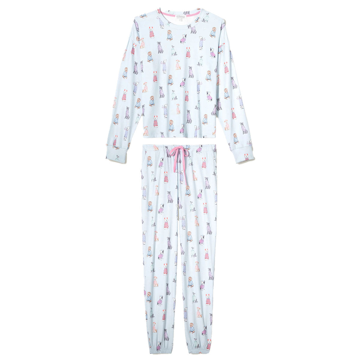 • Women’s light blue pajama set in dog print with crewneck top and banded cuff pants.