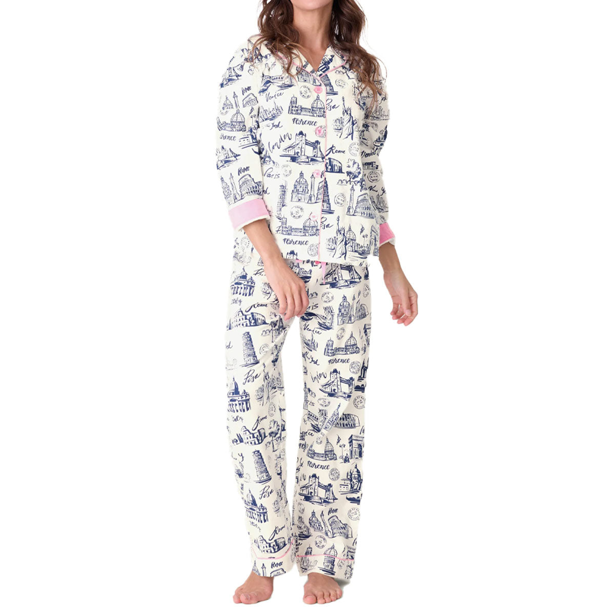 Wrap yourself in comfort and style with the P.J. Salvage Bon Voyage Flannel Pajama Set . Made from soft, breathable cotton twill, this three-piece set includes a button-up shirt, relaxed pants, and a matching headband. Featuring delicate sketches of famous landmarks like the Arc de Triomphe and Brooklyn Bridge, it adds a subtle adventurous charm to your evenings. Ideal for lounging or sleeping, this set ensures cozy nights with a touch of wanderlust-inspired elegance.