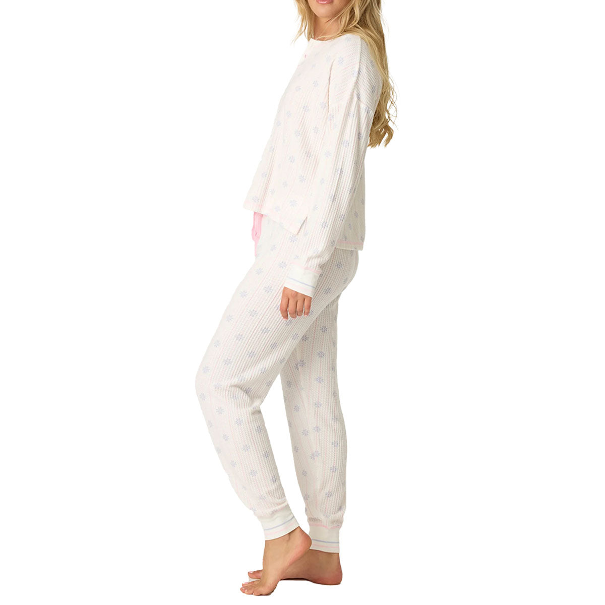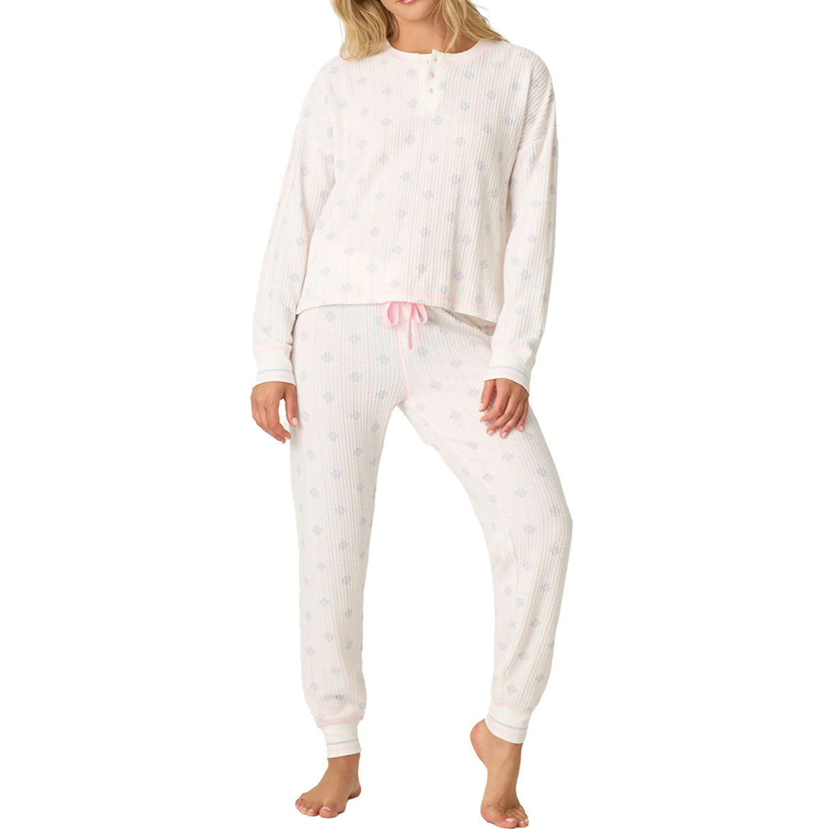The ultimate après ski uniform—this snowflake-print P.J. Salvage pajama set is crafted from soft brushed thermal with the perfect touch of stretch. The long-sleeve henley top and jogger pants feature delicate blue snowflakes drifting across an ivory backdrop, finished with striped cuffs and a playful pink tie waist. Whether you’re curled up by the fire with a hot cocoa, sipping your favorite cocktail under a blanket, or winding down with a movie after a day on the slopes, this set makes every snow day feel extra cozy.
