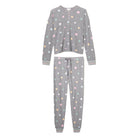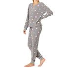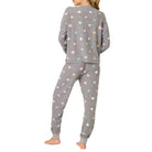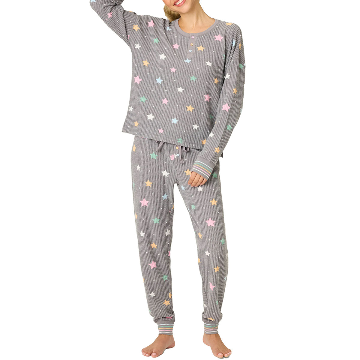 - Women’s grey pajama set in brushed thermal with star print, long-sleeve henley top, and jogger pants with striped cuffs.