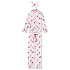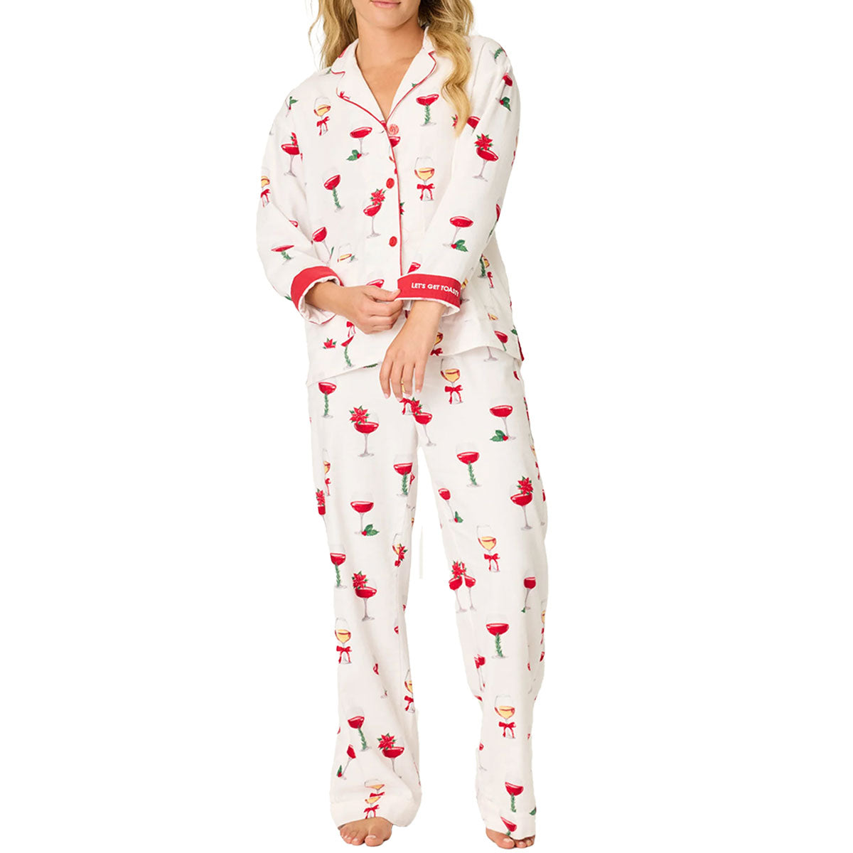 Raise a glass to cozy season in this ivory cotton flannel pajama set, patterned with festive wine glasses topped with poinsettias, bows, and sprigs of holly. This plus-size three-piece design includes a button-down top finished with red piping, relaxed drawstring pants, and a matching headband—perfect for holiday happy hours, wrapping marathons, and fireside lounging.