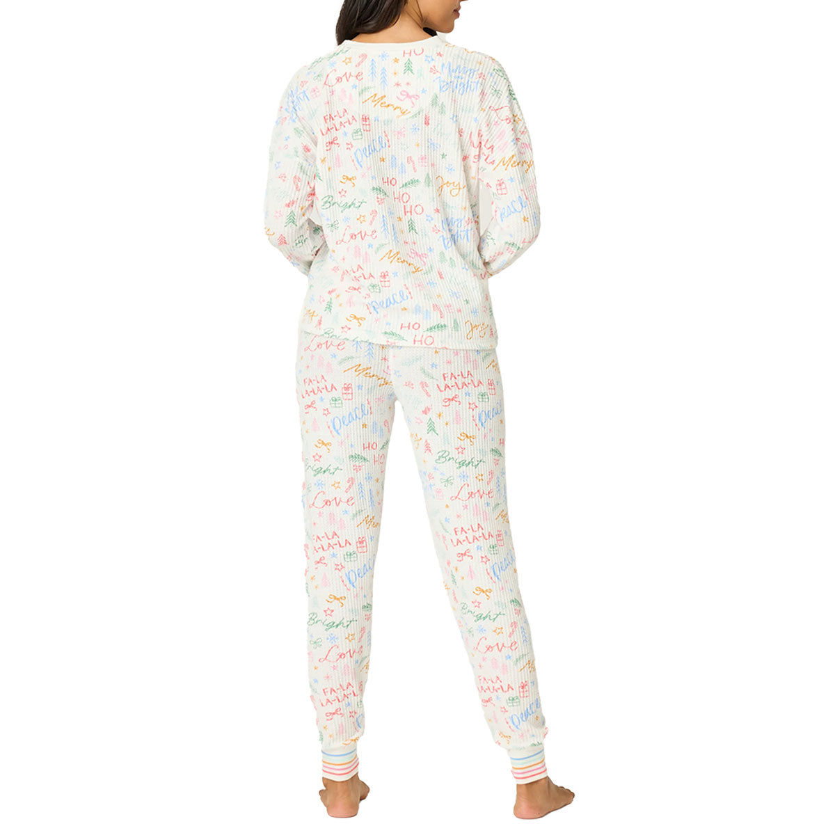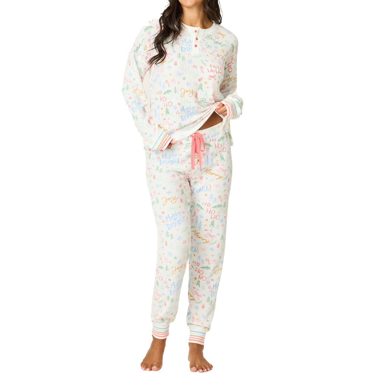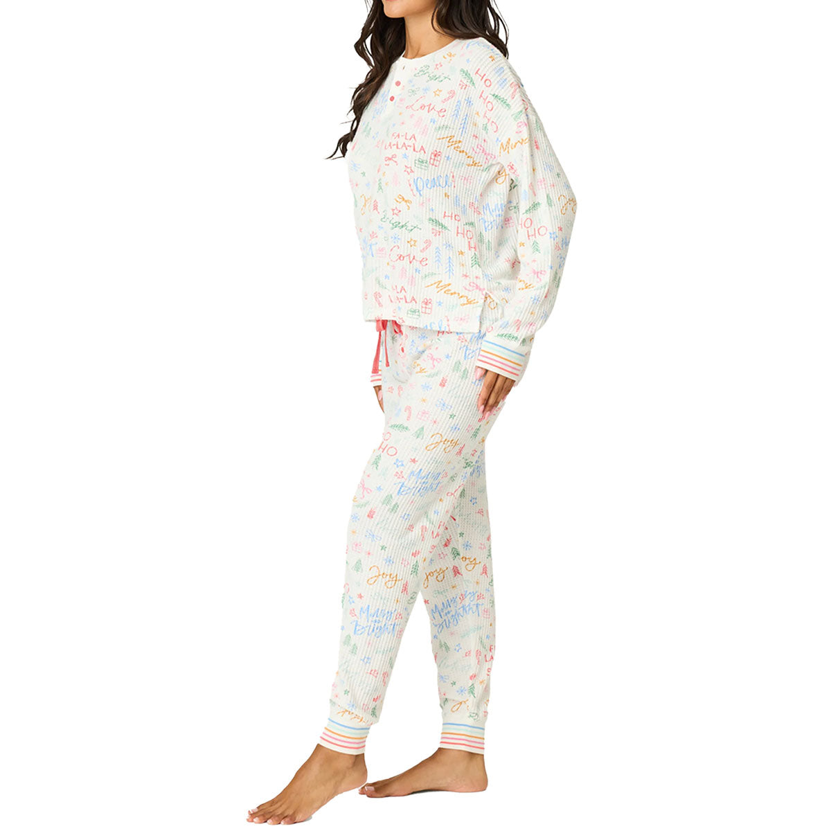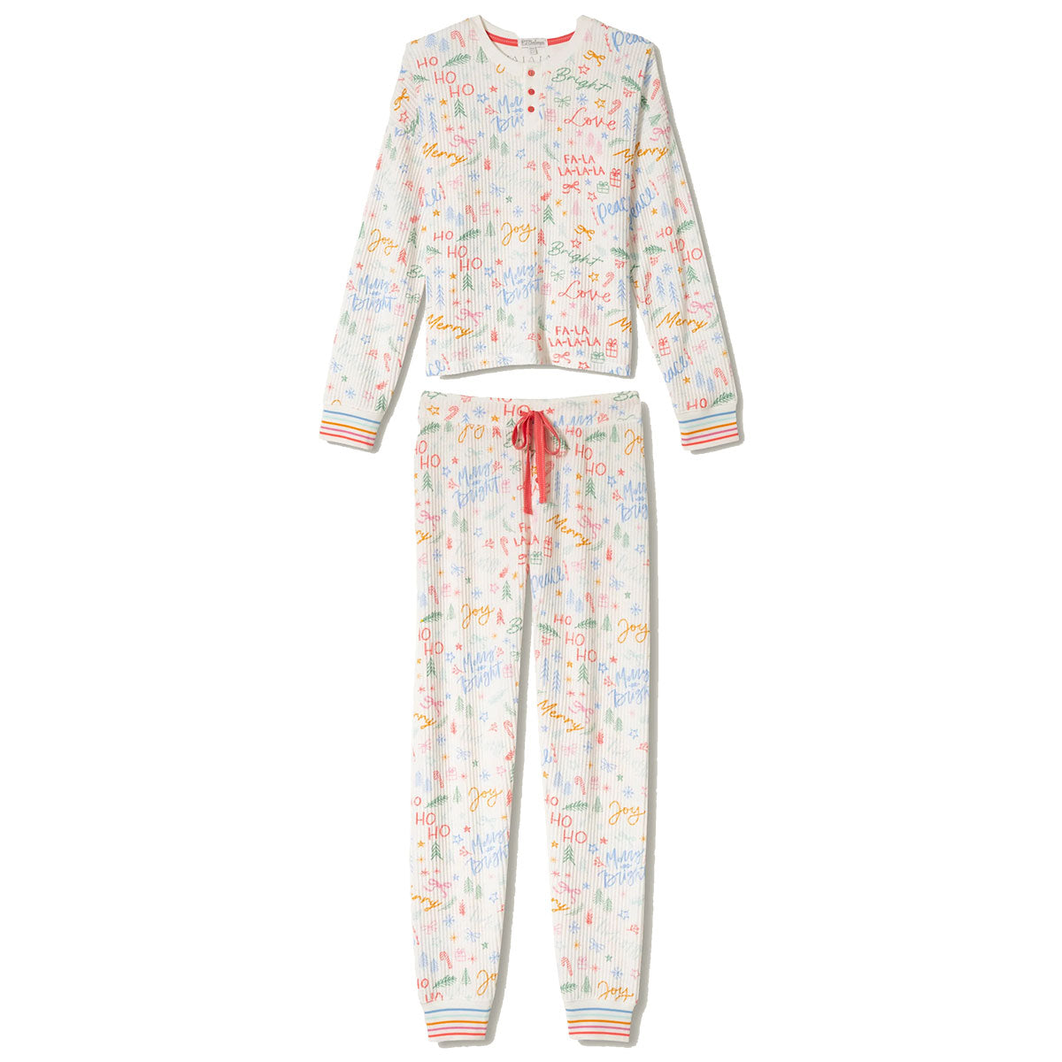 - Women’s ivory brushed thermal pajama set with colorful holiday lettering, long-sleeve henley top with red buttons, jogger pants with red tie, and rainbow-striped cuffs.