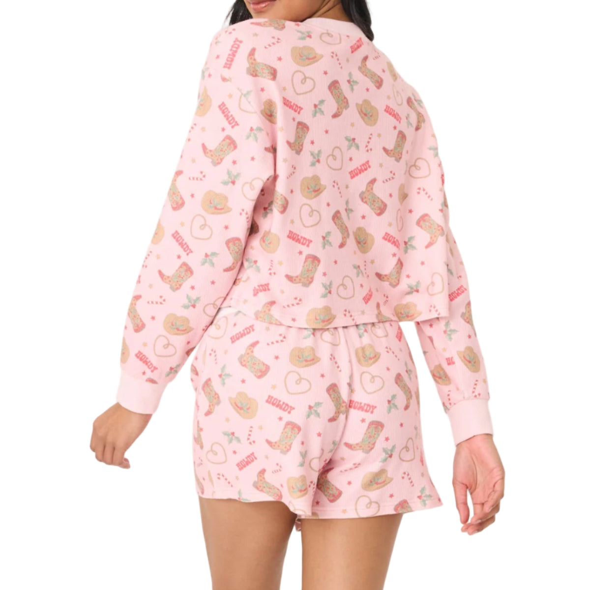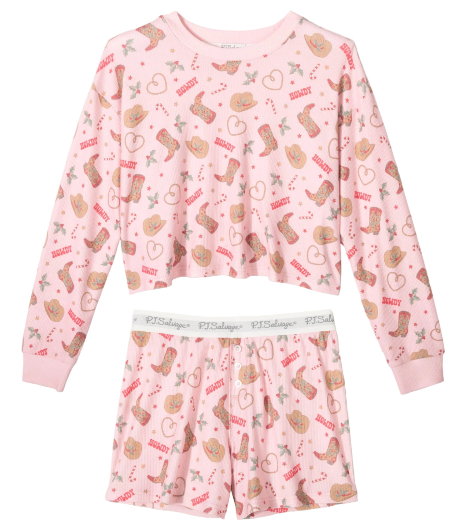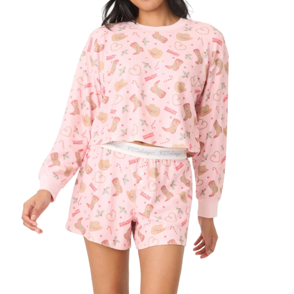 Kick back with a playful western twist in this P.J. Salvage pink two-piece pajama set. Crafted from baby peachy waffle, it features cowboy hats, boots, and stars across a long-sleeve top and boxer shorts—holiday lounging with a western spirit.