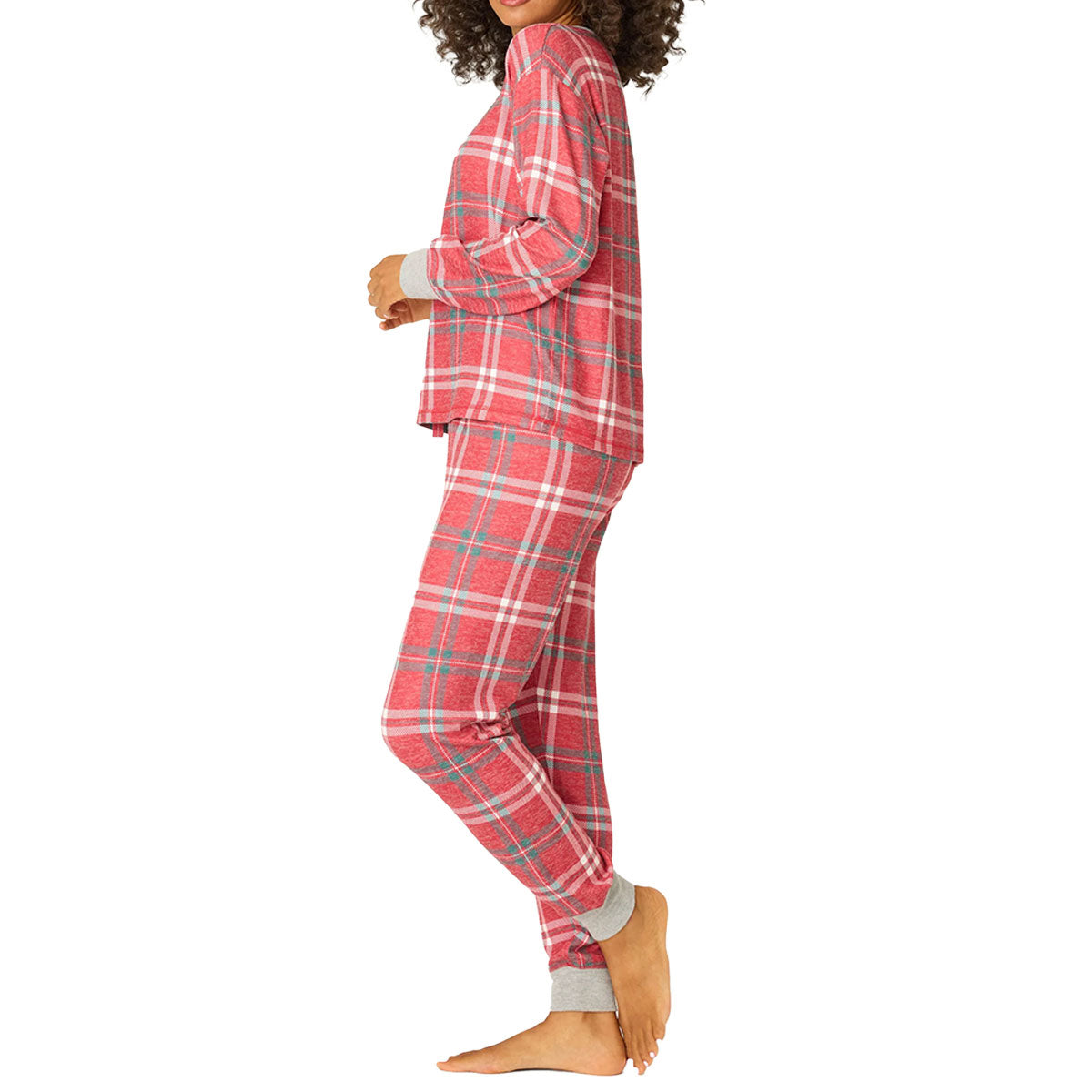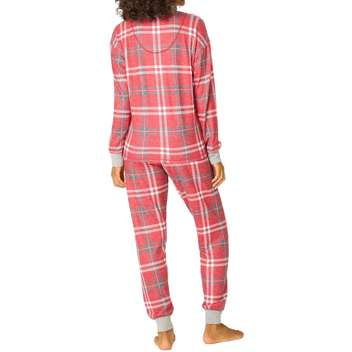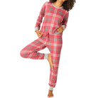 • Women’s red pajama set in peachy jersey with allover plaid print, long sleeve crew top with contrast cuffs, and drawstring pants with cuffed hems.