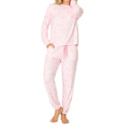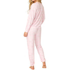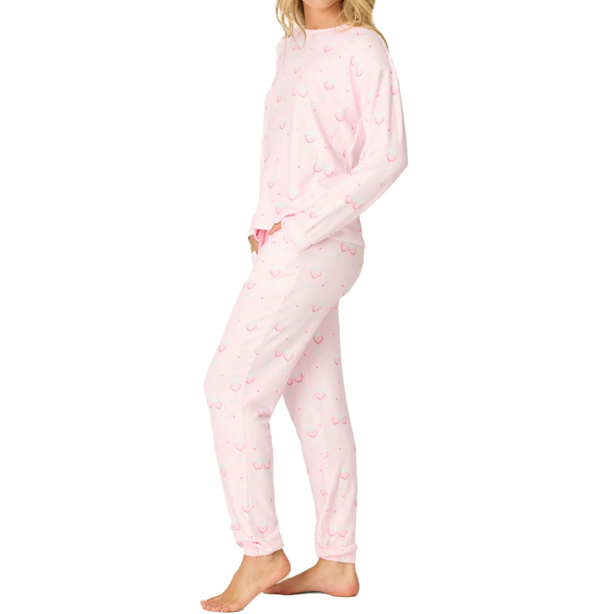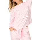 Playful and pretty in light pink, this two-piece P.J. Salvage pajama set toasts to love, comfort, and cozy nights in. Crafted in ultra-soft butter jersey, it includes a relaxed long-sleeve top and matching banded pants patterned with heart-shaped wine glasses—a sweet, cheeky combo for lounging and unwinding.