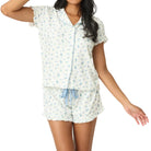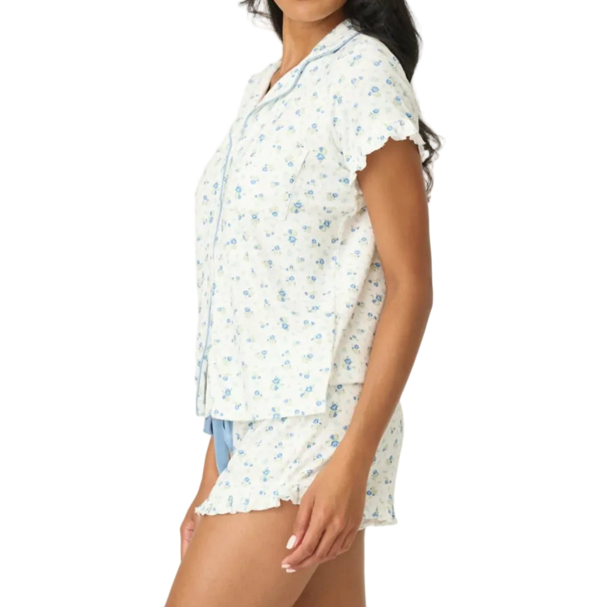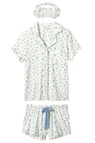Soft ivory florals meet delicate ruffles in this dreamy P.J. Salvage three-piece pajama set. Crafted from double-brushed pointelle that’s smooth and lightly textured, it includes a short-sleeve button-down top, ruffled shorts with a blue drawstring, and a matching eye mask trimmed in frill. The tiny blue blossoms add a sweetly vintage touch—made for mornings that linger and nights that wind down softly.