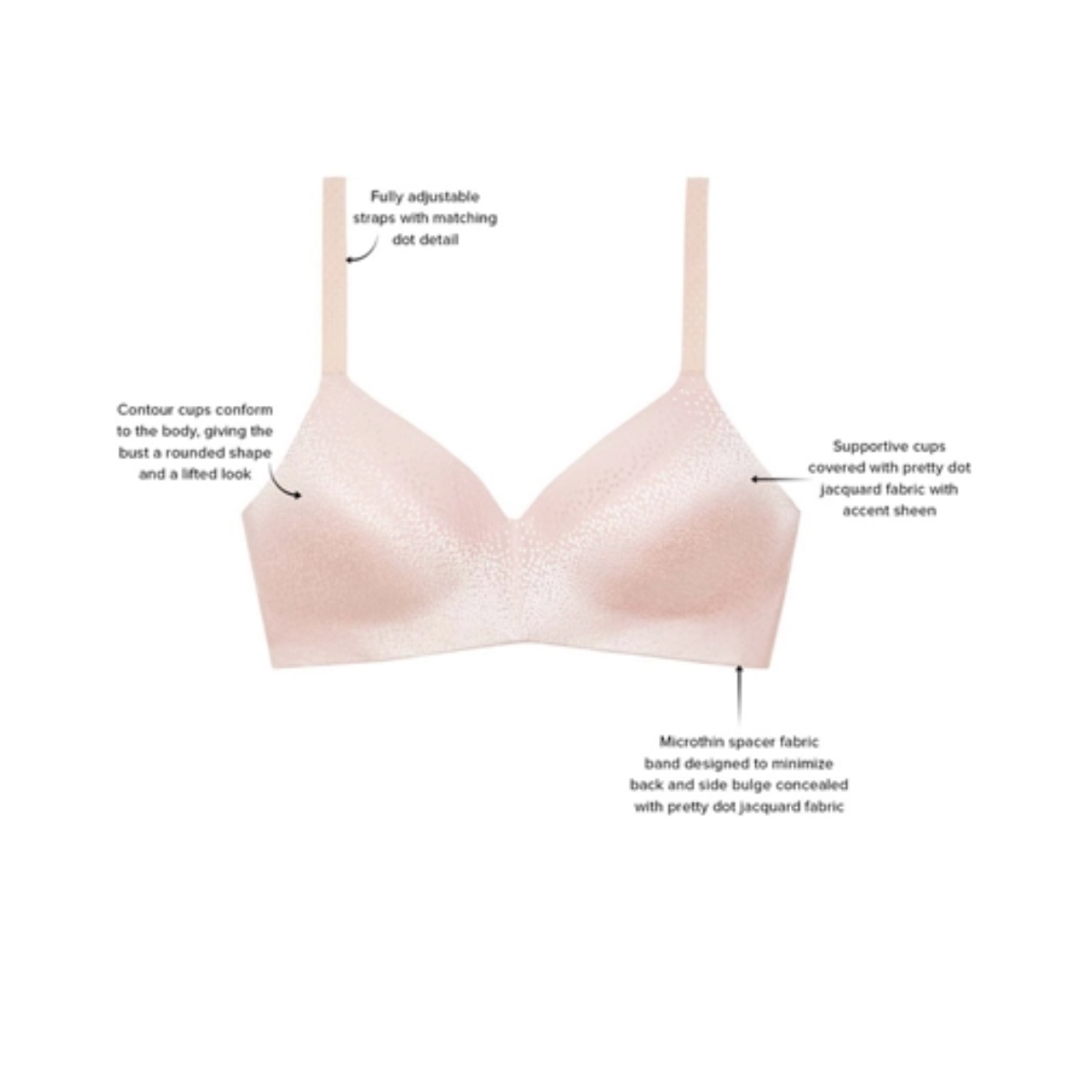 Experience effortless comfort and confidence with this Wacoal wire-free t-shirt bra designed for everyday wear. The seamless construction and full-coverage foam cups deliver a beautifully rounded silhouette while the innovative microthin spacer band smooths your profile under any outfit. Adjustable straps ensure a personalized fit, and the pretty dot jacquard fabric with subtle sheen adds an elegant touch beneath your clothes. Say goodbye to visible lines and hello to all-day support and a polished look.