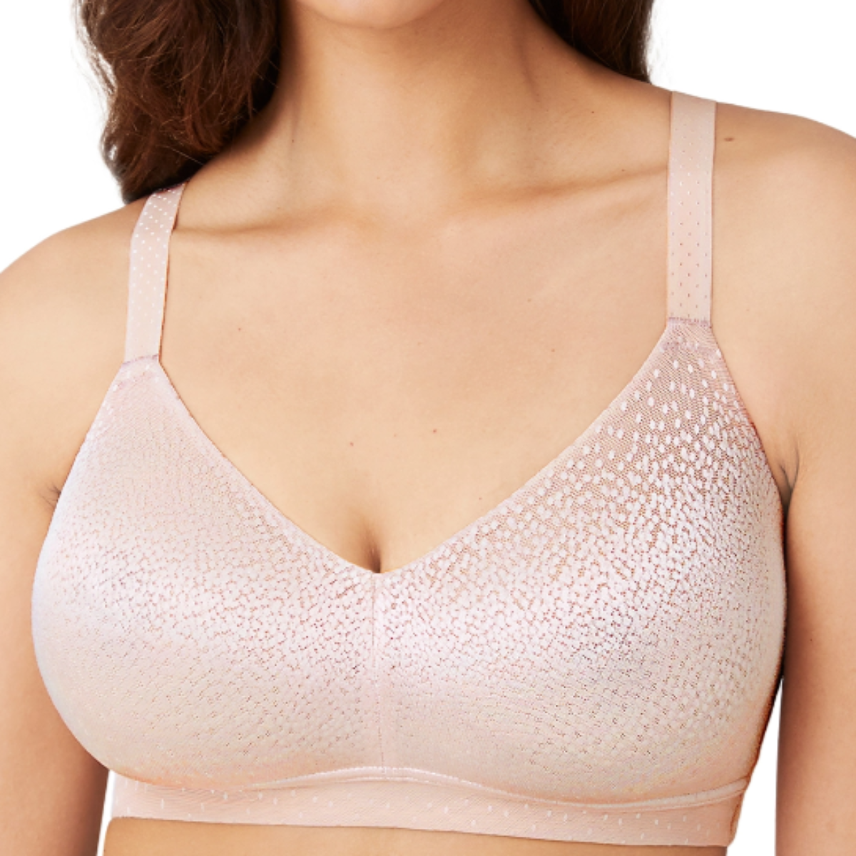Experience comfort and confidence with the Wacoal Back Appeal Wire Free Bra. Its seamless, wire-free design features mid-coverage two-ply cups with soft inner fabric and elegant dot jacquard overlay. The microthin spacer fabric band smooths back and sides, minimizing bulges for a sleek silhouette. Extra coverage and a hidden sling provide support and shaping, while fully adjustable, close-set front straps ensure a perfect, customized fit.