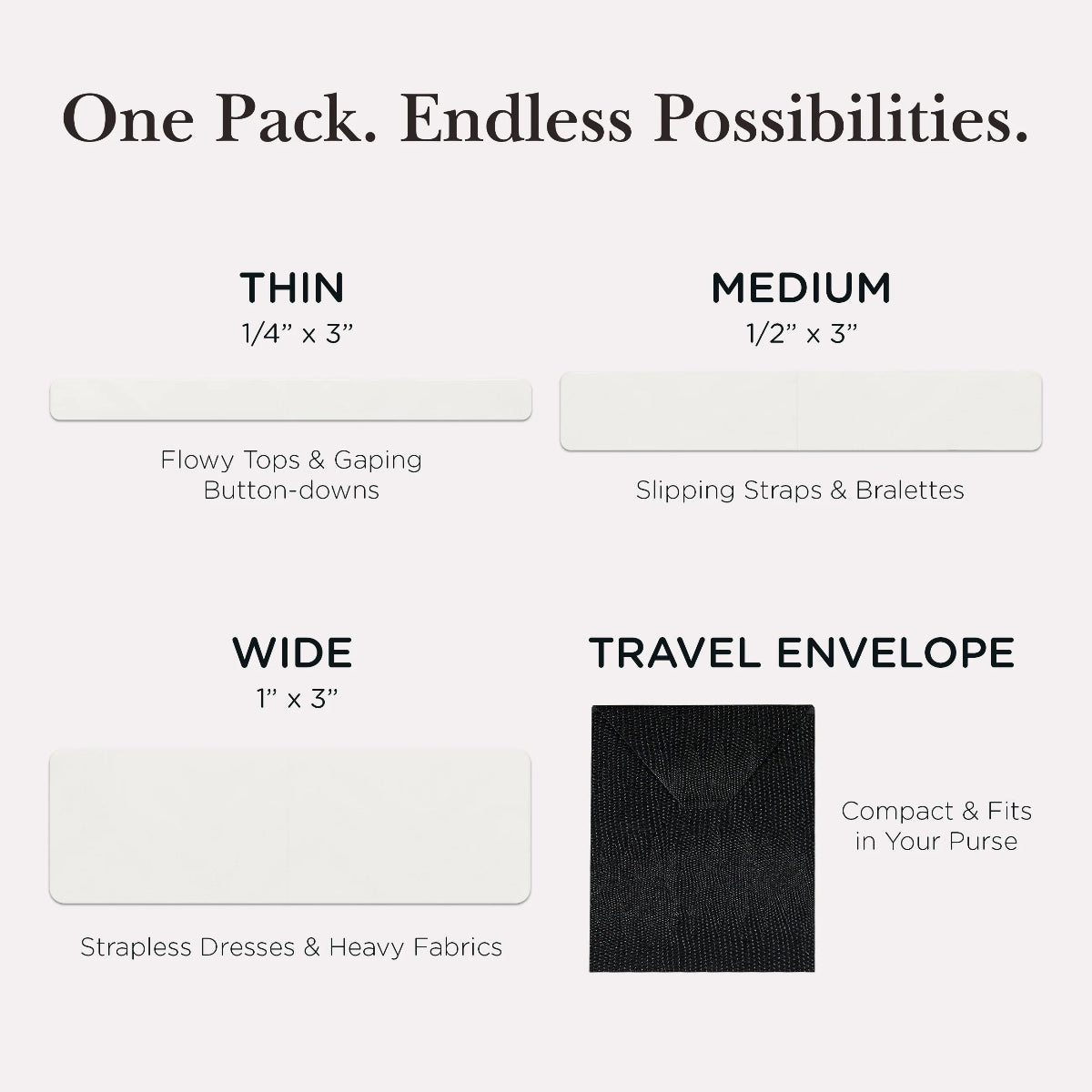 - CONTENTS: 18 THIN STRIPS - Holds lightweight, flowy fabrics - 10 MEDIUM STRIPS - Secures slipping shoulder straps - 4 WIDE STRIPS - Extra hold on strapless styles