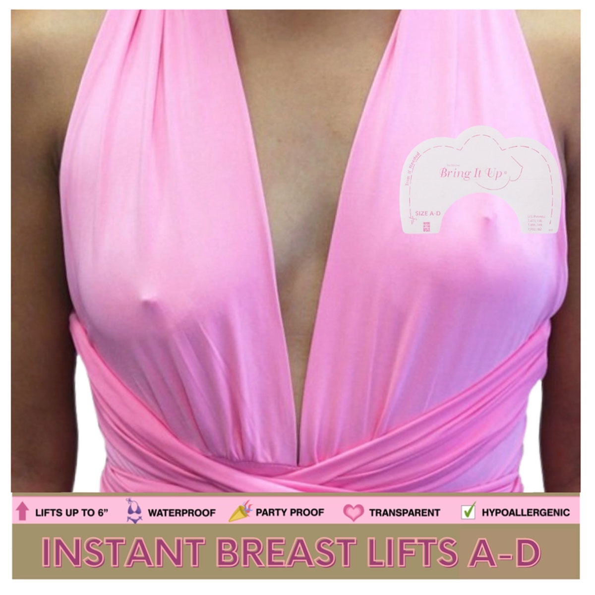 The Bring It Up Original Instant Breast Lift Tape offers transparent, waterproof, and hypoallergenic support with its patented method. Say goodbye to back fat and bra overflow and hello to a more youthful, natural appearance. Let yourself feel confident and comfortable in any outfit, from backless to plunging dresses and tops.