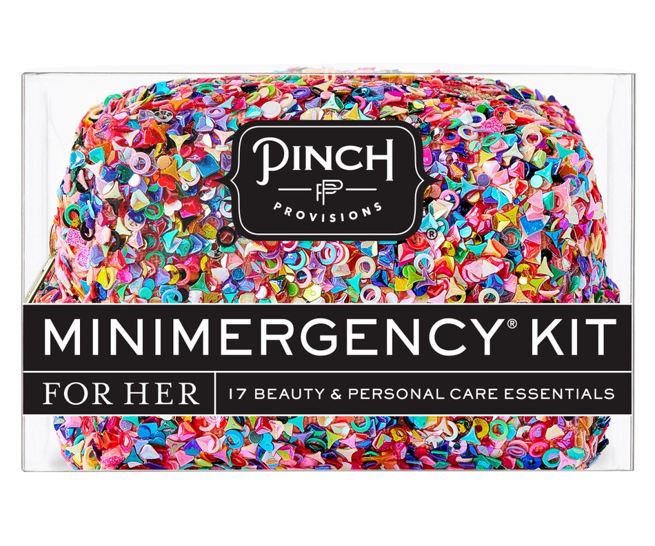 The name says it all. The glitter is big. The energy is big. And the kits are packed with day-saving essentials. Multicolor glitter is always among our best-sellers, and this BGE collection takes it to a whole new level. With 17 beauty, personal care, and style essentials, our signature petite pouch contains everything you need IN A PINCH®. Kit contains: stain remover towelette, emery board, double-sided tape, pill container, safety pin, lip balm, mending kit, mini comb, hair bands, dental floss, adhesive bandage, nail polish remover towelette, earring backs, deodorant towelette, extra buttons, compact mirror and breath freshener.
