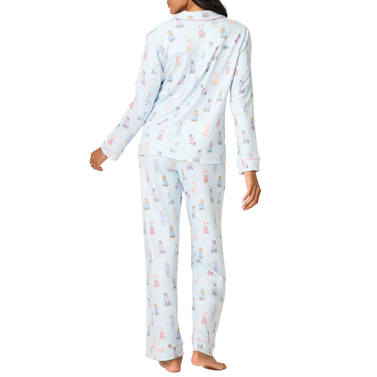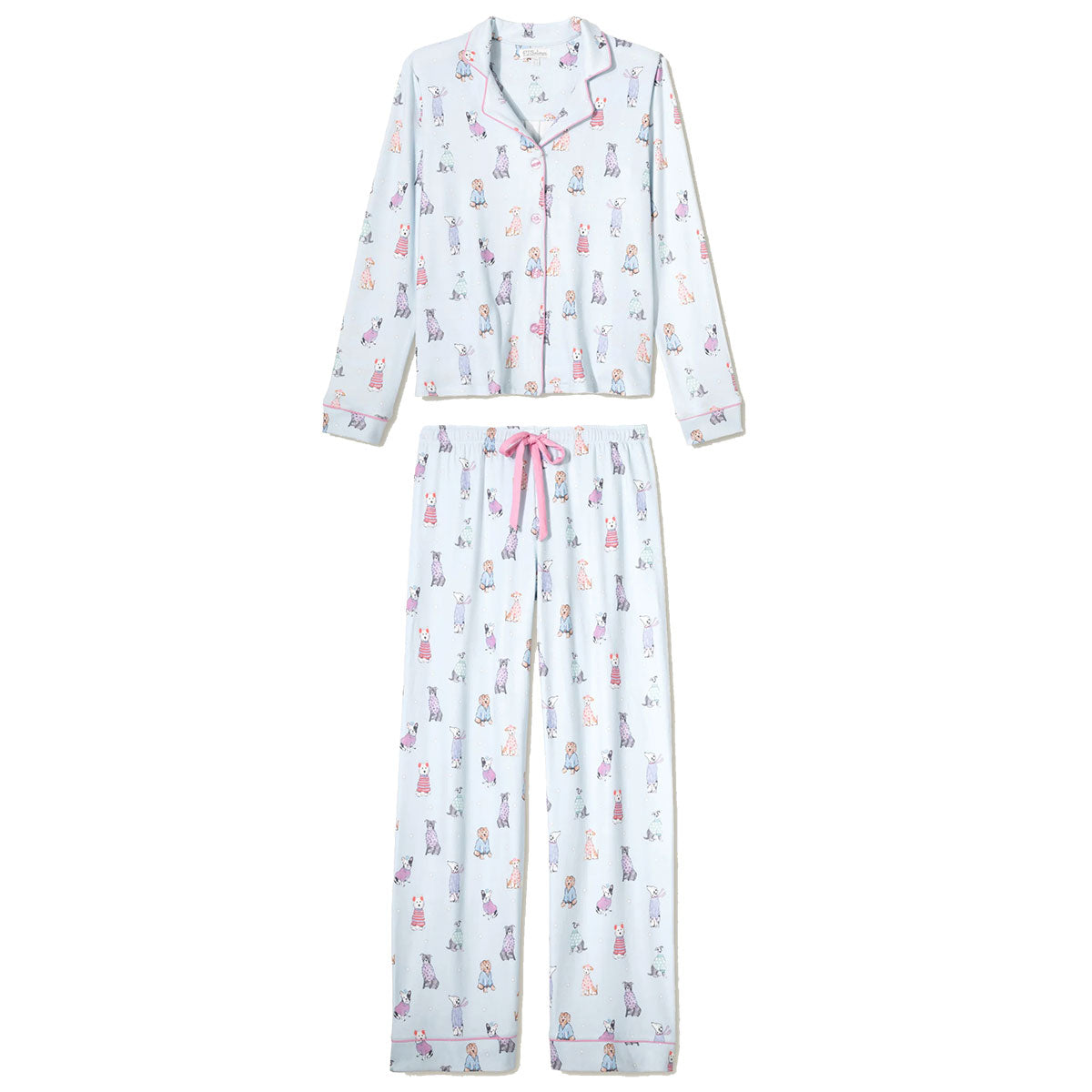 Paw-sitively cozy and snow much fun, this pajama set is crafted from double-brushed pointelle with a light blue backdrop dotted in playful pups dressed for winter. The button-front top and relaxed drawstring pants make it as classic as it is comfy—perfect for snow days, couch hangs, and curling up with your four-legged friend.