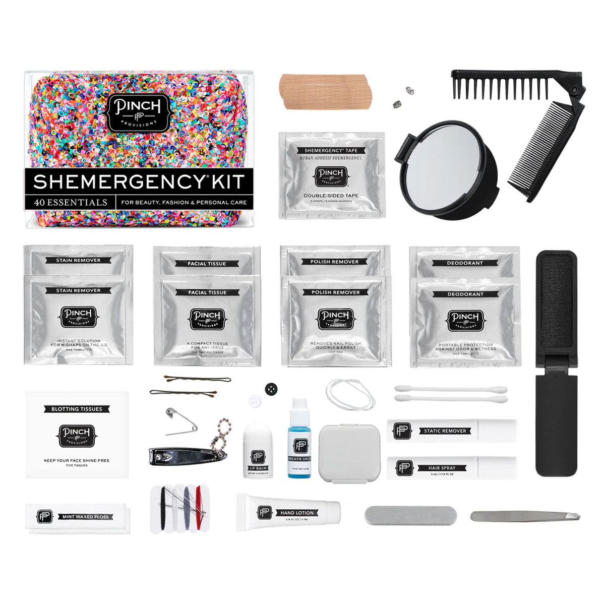 The Shemergency Survival Kit’s 40 essentials include: Hair spray, folding hair brush/comb, 2 clear elastics, 2 bobby pins, 2 earring backs, hand lotion, nail clipper, emery board, pill container, 2 nail polish remover pads, mending kit, safety pin, 5 double-sided tape strips, lint remover, 2 stain removing towelettes, static remover, breath freshener, lip balm, 2 single-use dental floss, 2 deodorant towelettes, extra buttons, 2 adhesive bandages, 2 facial tissues, blotting tissues, compact mirror, tweezers, and cotton swabs.
